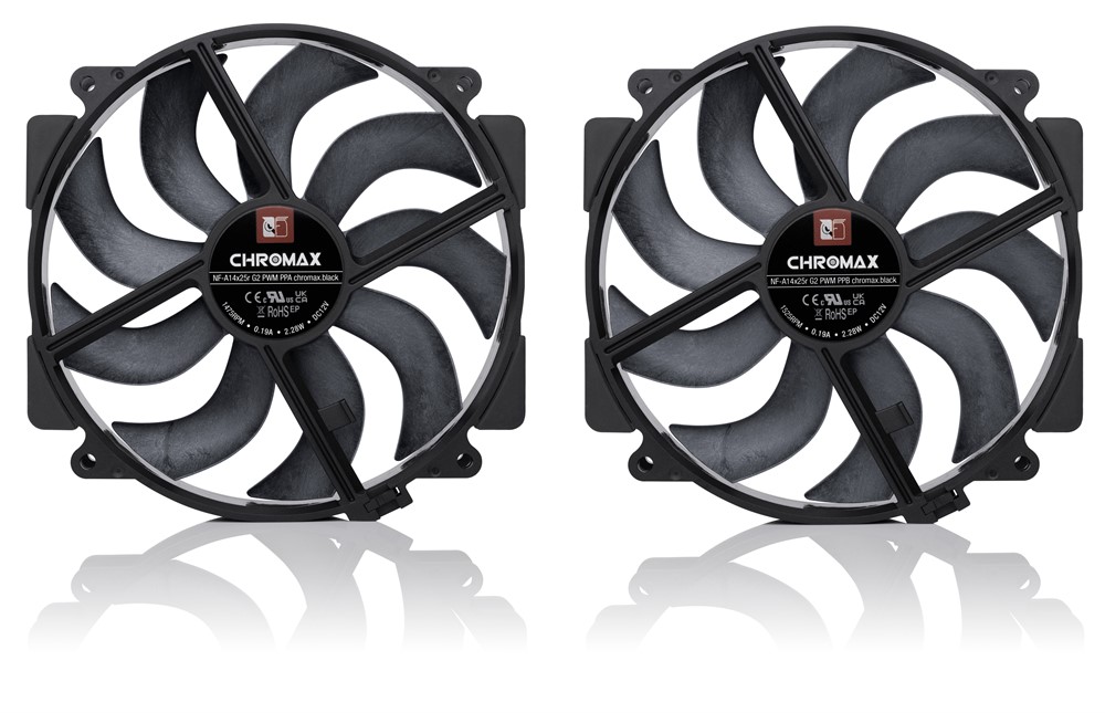 Topped off with Noctua’s trusted premium-grade SSO2 bearing, more than 150,000 hours MTTF and a 6-year manufacturer’s warranty, the NF-A14x25r G2 PWM Sx2-PP chromax.black is the perfect choice for users who are looking for a dual 140mm round fan set that combines cutting-edge quality, quietness and performance in an all-black style.